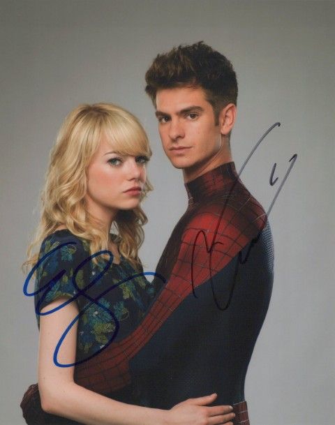 Andrew Garfield / Emma Stone in person signed photo from the movie THE AMAZING SPIDER-MAN. Andrew Garfield as the character Peter Parker / Spider-Man. Emma Stone as the character Gwen Stacy.