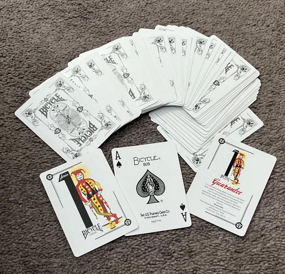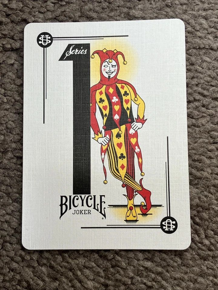 You are looking to buy one Bicycle Limited Edition Series 1 playing cards deck new. The deck was the first of a series of 10 Limited Edition playing card decks that Bicycle introduced to appeal to collectors and players everywhere. But they have been discontinued and are no longer made. These decks are traditional Bicycle quality, but with some new twists to appeal to collectors and even magicians. Note the backs are a simpler, cleaner version of the traditional Rider Back in black and white. The jokers are redesigned specifically for this series. The card faces are standard index, the same courts and fonts seen for years on Bicycle decks. Each deck also includes two advertising cards. The cards have Air Cushion Finish. These are FACTORY FRESH cards, wrapped in cellophane, never opened or used.